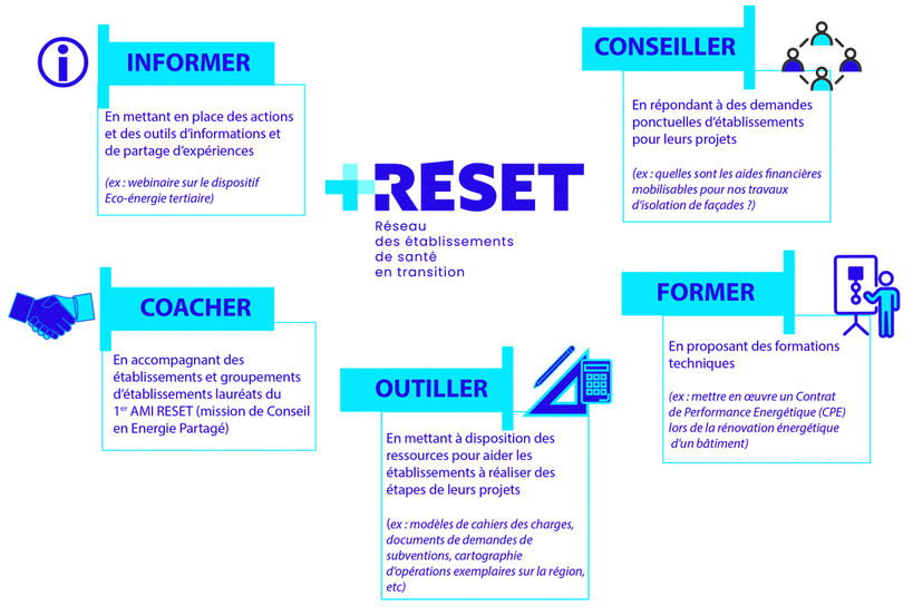 Mis en place à l’initiative de l’ARS, l’ADEME et la Banque des territoires et animé par le Pôle énergie Bourgogne-Franche-Comté, RESET a pour vocation d’informer et d’accompagner les établissements de santé et médico-sociaux de la région qui souhaitent :
